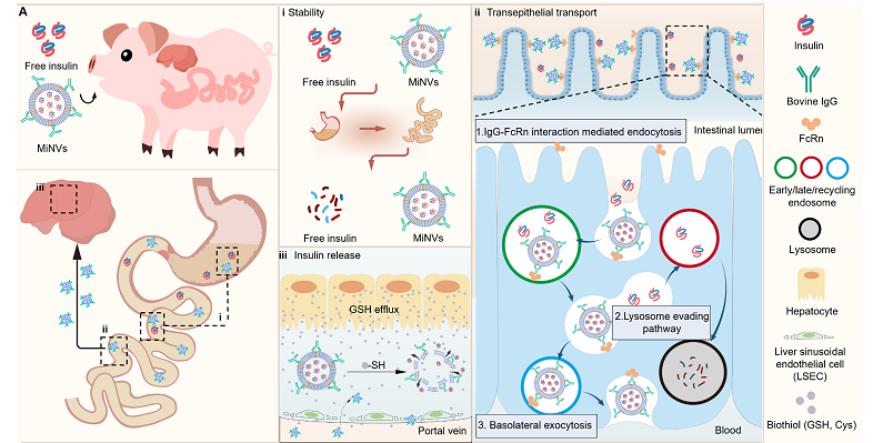 近期,国家纳米科学中心梁兴杰研究团队在Science Advances上报道了一种基于牛奶来源纳米囊泡(milk-derived nanovesicles,MiNVs)的口服胰岛素递送新策略。该研究为解决口服胰岛素开发过程中肠道和肝脏屏障的难题给予了一种新的思路,为糖尿病治疗开辟了潜在的应用前景。相关成果以“Site-specific adaptive nanovesicles for oral insulin delivery”为题发表于《科学进展》(Science Advances)。